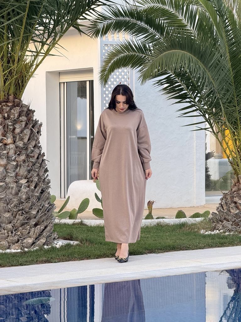 Ensemble décontracté et élégant, composé d’une robe ample avec manches longues. Disponible en plusieurs couleurs douces, cet ensemble offre une allure sobre et chic, parfait pour les journées où le confort est essentiel. La coupe fluide et le tissu doux apportent une sensation agréable tout au long de la journée. Idéal pour une sortie entre amis ou pour des moments de détente. Détails : • Robe longue avec manches amples pour un maximum de confort • Disponible en couleur taupe et bleu • Coupe décontractée, idéale pour un style élégant sans effort • Matière : Mélange de coton pour une sensation douce et confortable Taille unique Conseils de style : Complétez ce look avec un sac à chaîne et des accessoires minimalistes pour une touche de sophistication.